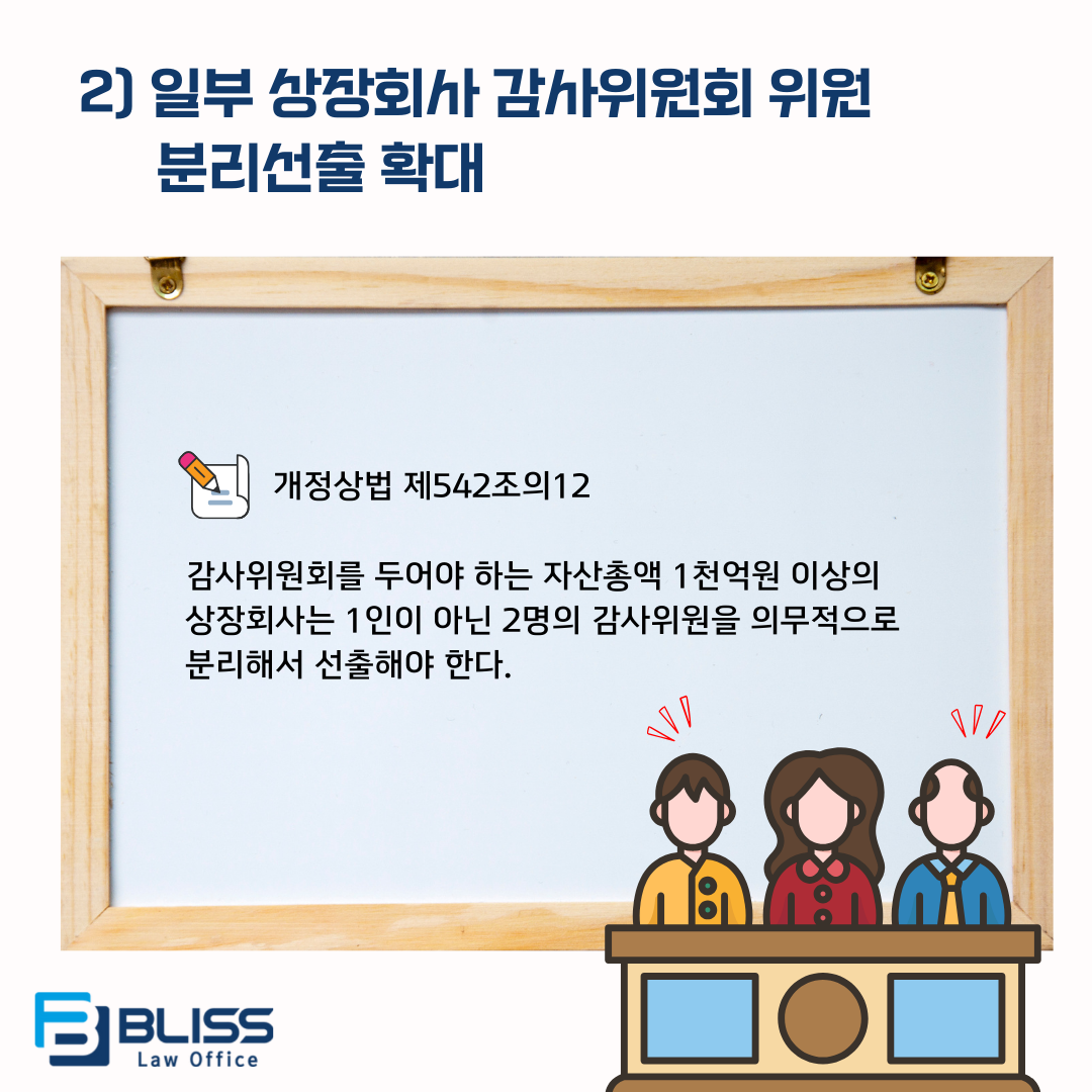 이번 상법 개정으로 감사위원회를 두어야 하는 자산총액 1천억원 이상의 상장회사는 1인이 아닌 2명의 감사위원을 의무적으로 분리해서 선출하는 것으로 확대되었습니다.