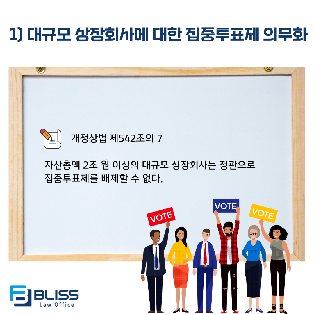 - 이러한 점을 고려하여 개정된 상법은 자산총액 2조 원 이상의 대규모 상장회사에 대해, 정관으로 집중투표제를 배제할 수 없도록 명문화했습니다(개정 상법 제527조 제3항).