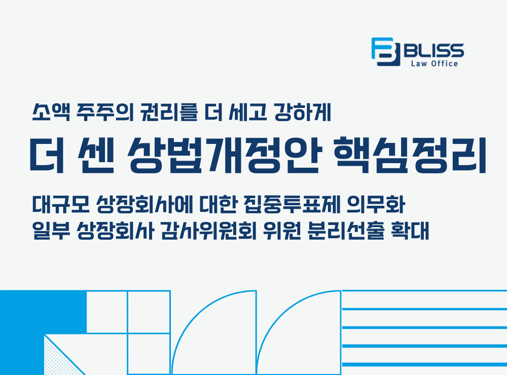 법률사무소 블리스는 상법 개정에 대한 자세한 설명과 실무 적용 방안 등 기업과 주주 입장에서의 맞춤형 법률상담 서비스를 제공하고 있습니다. 개정된 상법 도입에 따른 구체적인 자문이 필요하신 경우 법률사무소 블리스에 언제든 편하게 문의주시기 바랍니다.